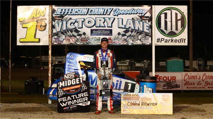Fairbury, Nebraska (July 12, 2025)………Everything Cannon McIntosh had accomplished over the past 11 days could be encapsulated in a mere 40 laps during Saturday night’s USAC NOS Energy Drink Midget National Championship feature at Fairbury, Nebraska’s Jefferson County Speedway.