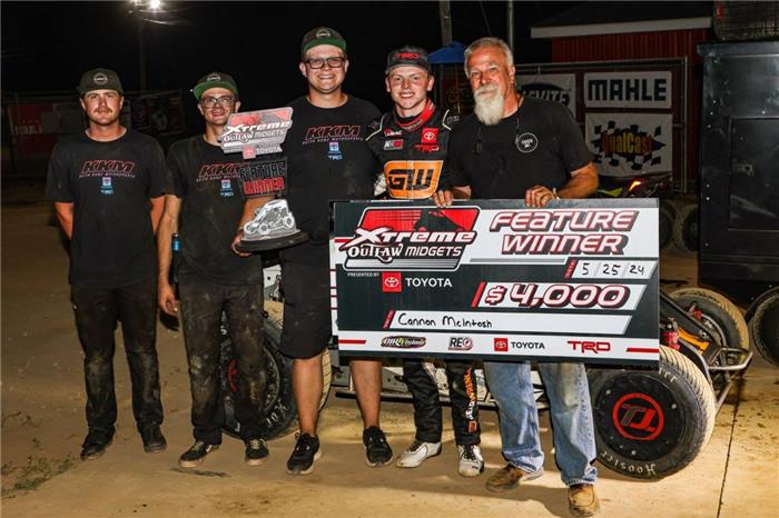 McIntosh, 21, of Bixby, OK, took to the high-banked, 3/8-mile oval of Atomic Speedway and put on a clinic for 25 laps, leading flag-to-flag for his third win of the season with the Xtreme Outlaw Midget Series presented by Toyota.