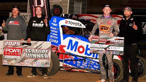 Sapulpa, OK. (3/20/25) Cannon McIntosh would perfect the field through lap traffic to earn his first feature win of 2025 while battling at Creek County Speedway, with the POWRi National and West Midget Leagues, in Night One of the Turnpike Challenge in a thrilling thirty lap feature event.